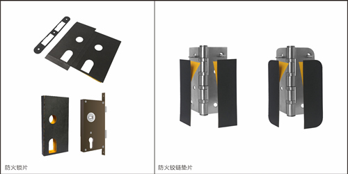 防火鉸鏈墊片:襯墊于防火門鉸鏈的后面,連接由于安裝鉸鏈而切斷的防火密封條,防止火災(zāi)中熱氣和火焰 通過此薄弱環(huán)節(jié),導(dǎo)致防火門的完整性喪失