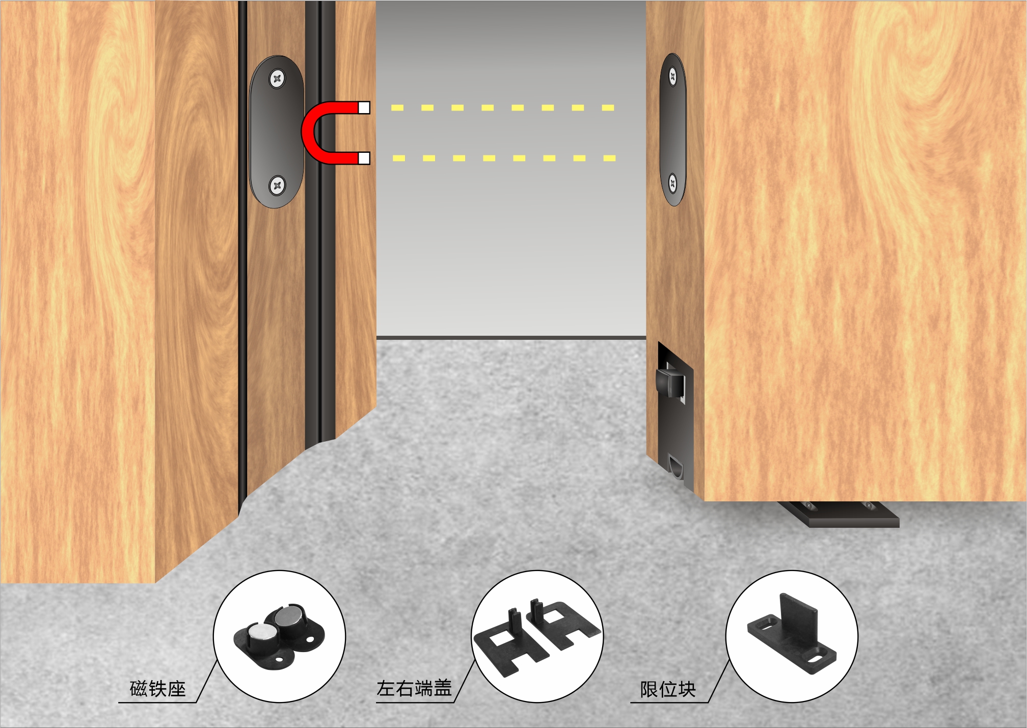 由強磁鐵鎖住關閉狀態(tài)。當人工外加開門拉力時,門扇移開,密封條自動上升。此過程膠條與地面無摩擦。
