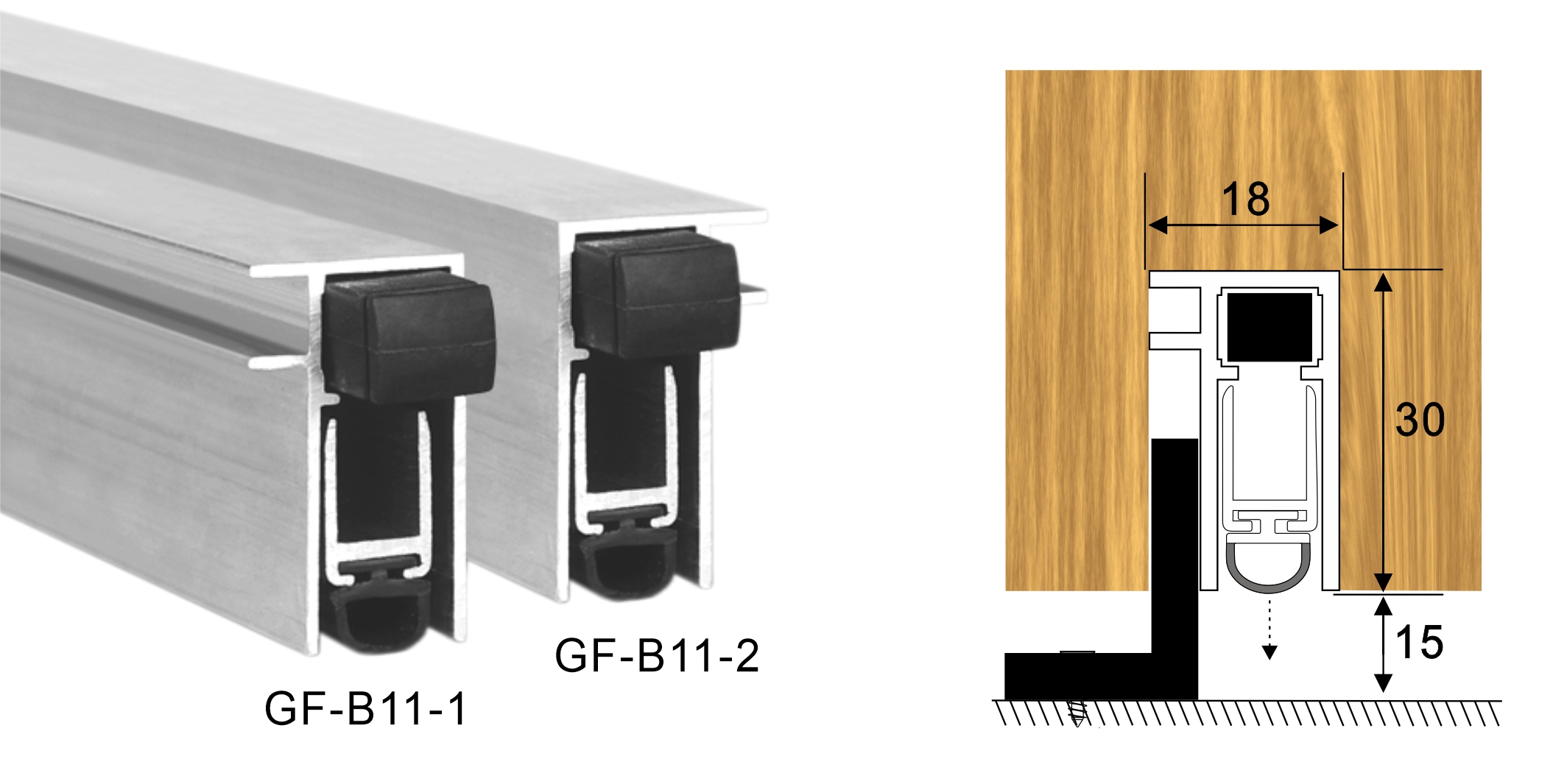 GF-B11是為移門特別設計的門底自動升降式密封器。當門滑行關閉時,按鈕碰壓門框,密封條自動下降,密封門底部的間隙。