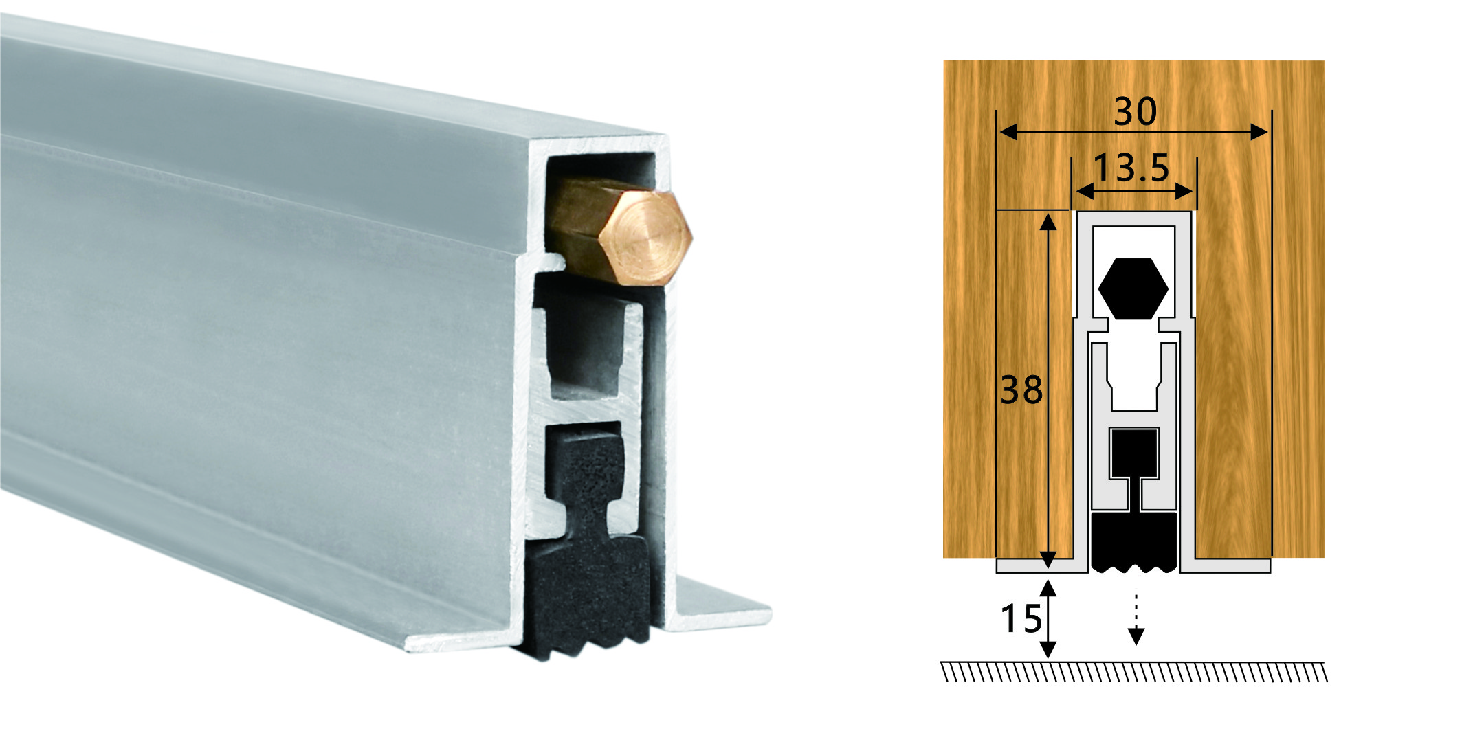 嵌入式門(mén)底自動(dòng)升降式密封器,M型彈簧結(jié)構(gòu),適用于門(mén)扇內(nèi)開(kāi)槽的門(mén)。安裝時(shí)需在門(mén)底有一個(gè)38mm*13.5mm的通槽,將產(chǎn)品放置其中,從產(chǎn)品的翼上固定,并將裝飾端蓋板用螺絲裝上,使用本產(chǎn)品不影響門(mén)的整體風(fēng)格。