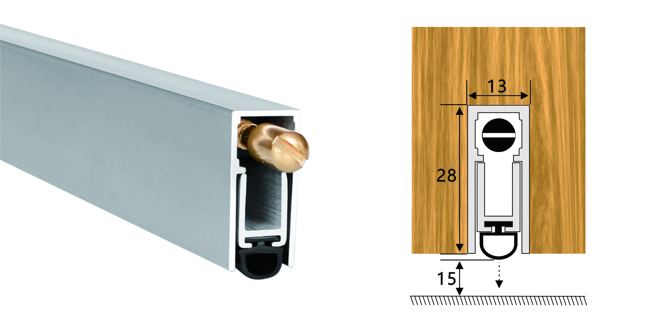 嵌入式門底自動(dòng)升降式密封器,四連桿機(jī)構(gòu),適用于門扇內(nèi)開(kāi)槽的門。安裝時(shí)需在門底有一個(gè)28mm*13mm的通槽,將產(chǎn)品放置其中,將兩端蓋板和密封器用螺絲固定(或用螺絲從密封條底部向上固定),使用本產(chǎn)品不影響門的整體風(fēng)格。