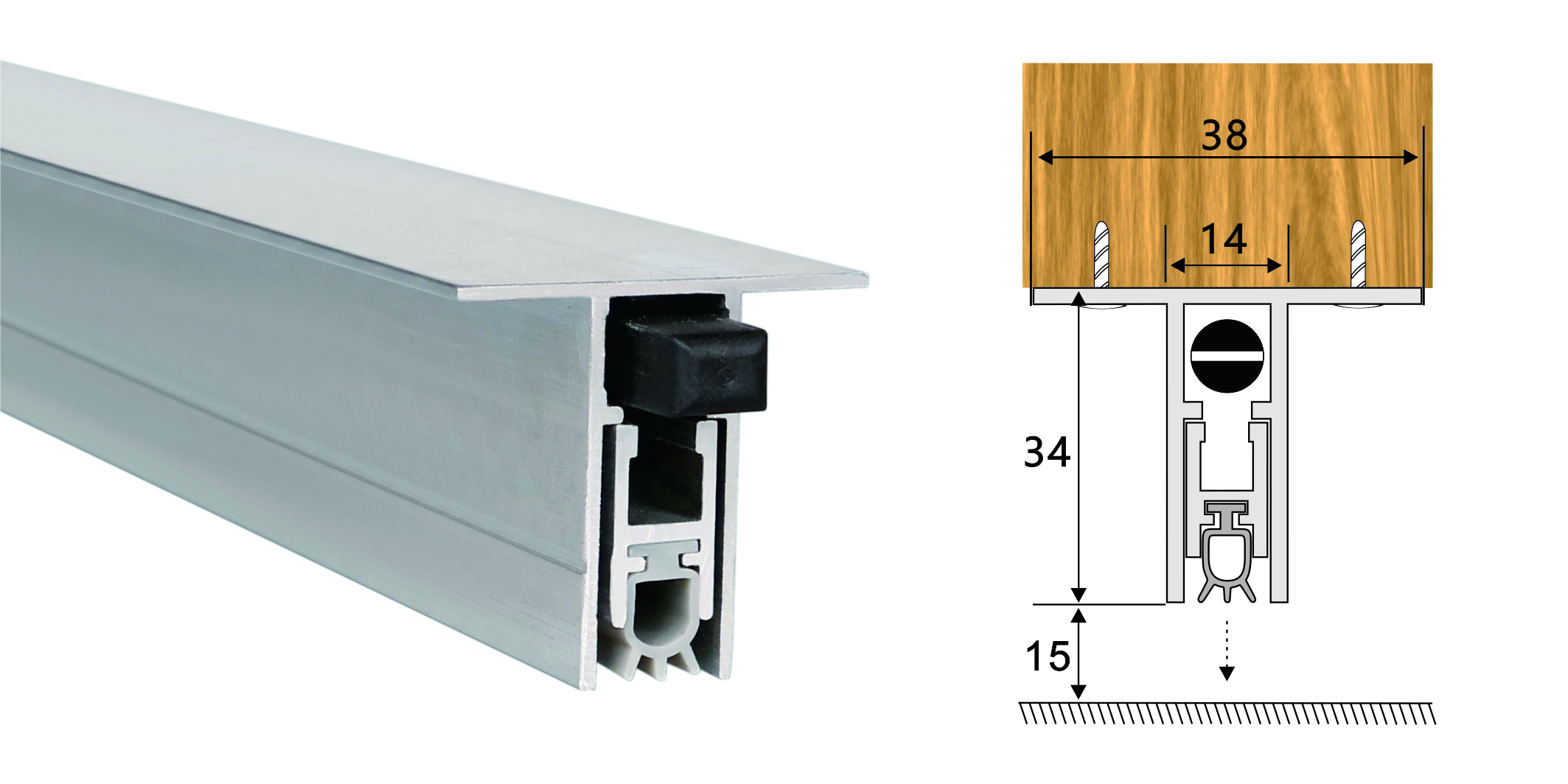 為省去門底開槽的工作,特別設(shè)計了B03的擴(kuò)展應(yīng)用的門底自動升降式密封器。只需設(shè)計時將門的高度做短34~35毫米,將自動門底條用螺絲從兩翼上直接固定,即可。其作用與B03一樣,密封條自動上升,膠條與地面無摩擦。